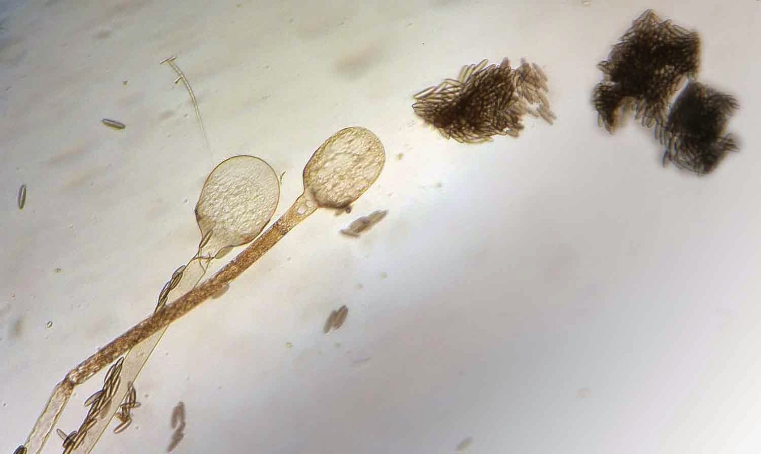 | Asexual spores of Syzygites megalocarpus are produced on the tips of branched sporangiophores. |