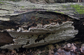 Conidia production had clearly not yet begun inside the ones I found since they were all still whitish. I bent down to photograph them. That's when I saw that some of them were actually white projecting shelves: Not only had I got myself a bunch of anamorphs, but I'd also found five Postia ptychogaster teleomorphs!